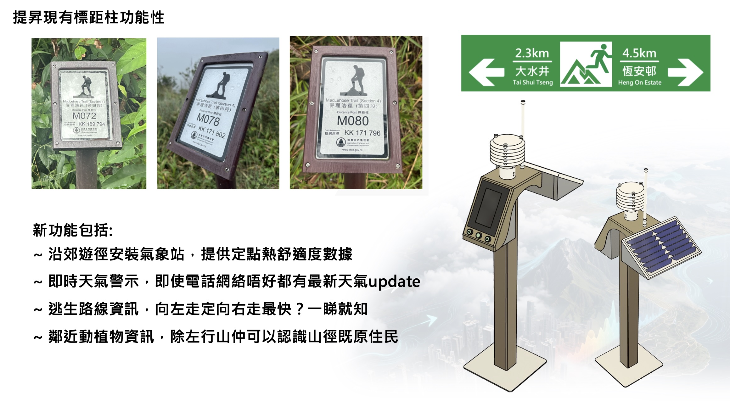 Initiated by doctoral students from the Department of Geography of the University of Hong Kong and the Department of Building Services Engineering of the Hong Kong Polytechnic University, the team aims to adopt LoRa technology in modernizing the existing distance post and expand the real-time weather observation network along the hiking trails and campsites. MacLehose Trail (Section 4) was chosen for the trial to provide latest updates on microclimate forecasts and evacuation suggestions, in hopes that the solution can improve the safety and comfort of hikers more effectively.